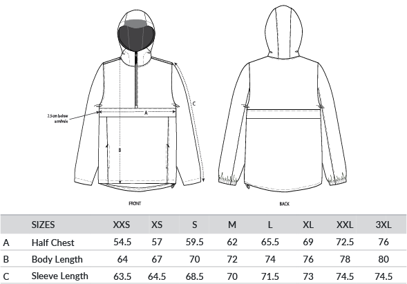 Longer back length with curved hem for protection. Bottom hem and hood with adjustable plastic stopper and elastic cord. Sealed hood visor. Zipped welt pockets. Non-functional flap, front and back. Self-fabric half-moon at back neck. Inside zip opening at bottom hem and inside loop, with snap at armhole providing easy access for chest decoration. Oeko-Tex certified. Vegan certified. Fairwear Foundation certified.